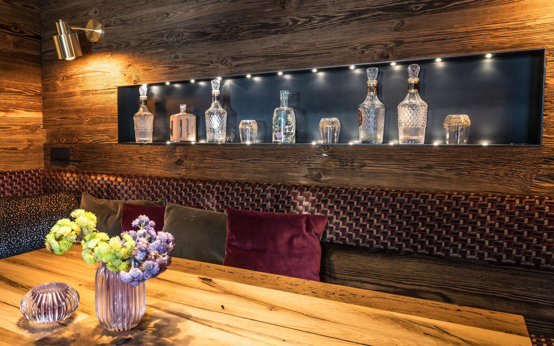 Ein Zusammenspiel mit kräftigen Akzenten zwischen Altholz, Polsterung, Beschlag und Lampen im Gold-Design, dunklen Küchenfronten mit Arbeitsplatte in Messing massiv mit eingeschweißtem Spülbecken