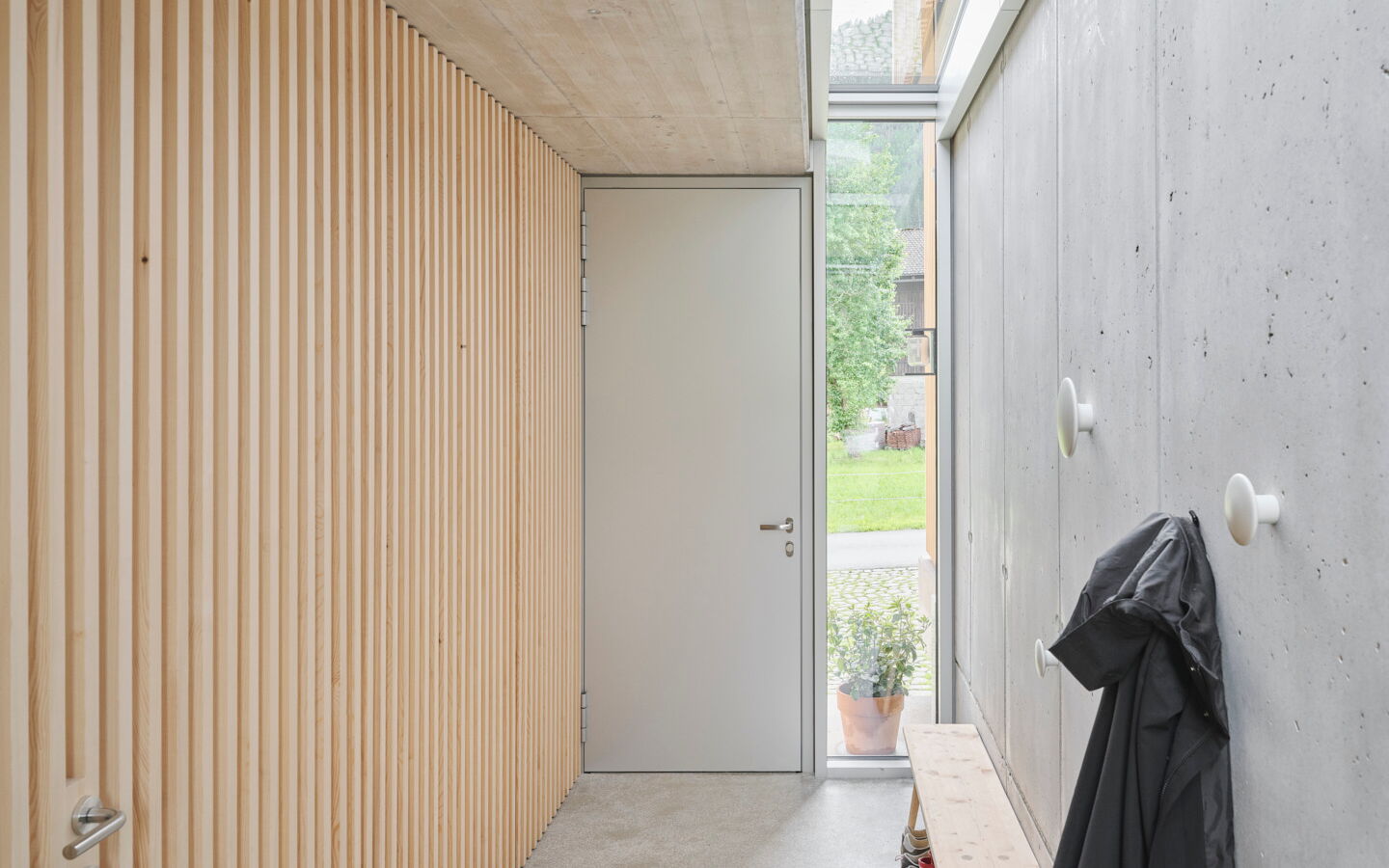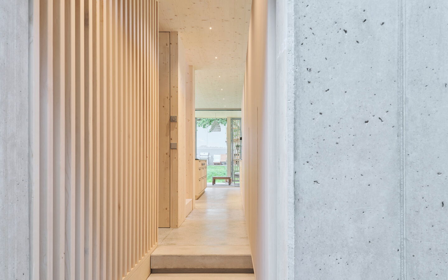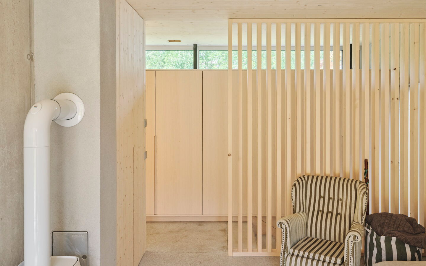 - Im Eingangsbereich wurden in einem raumhohen Wandkonzept in Stäbchenoptik 2 Innentüren und ein 4-türiger Garderobenschrank unsichtbar integriert